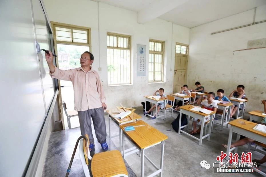 柳州市融安县东起乡长丰村小学,腿部残疾的老师李朝文在给学生上课。谭凯兴 摄
